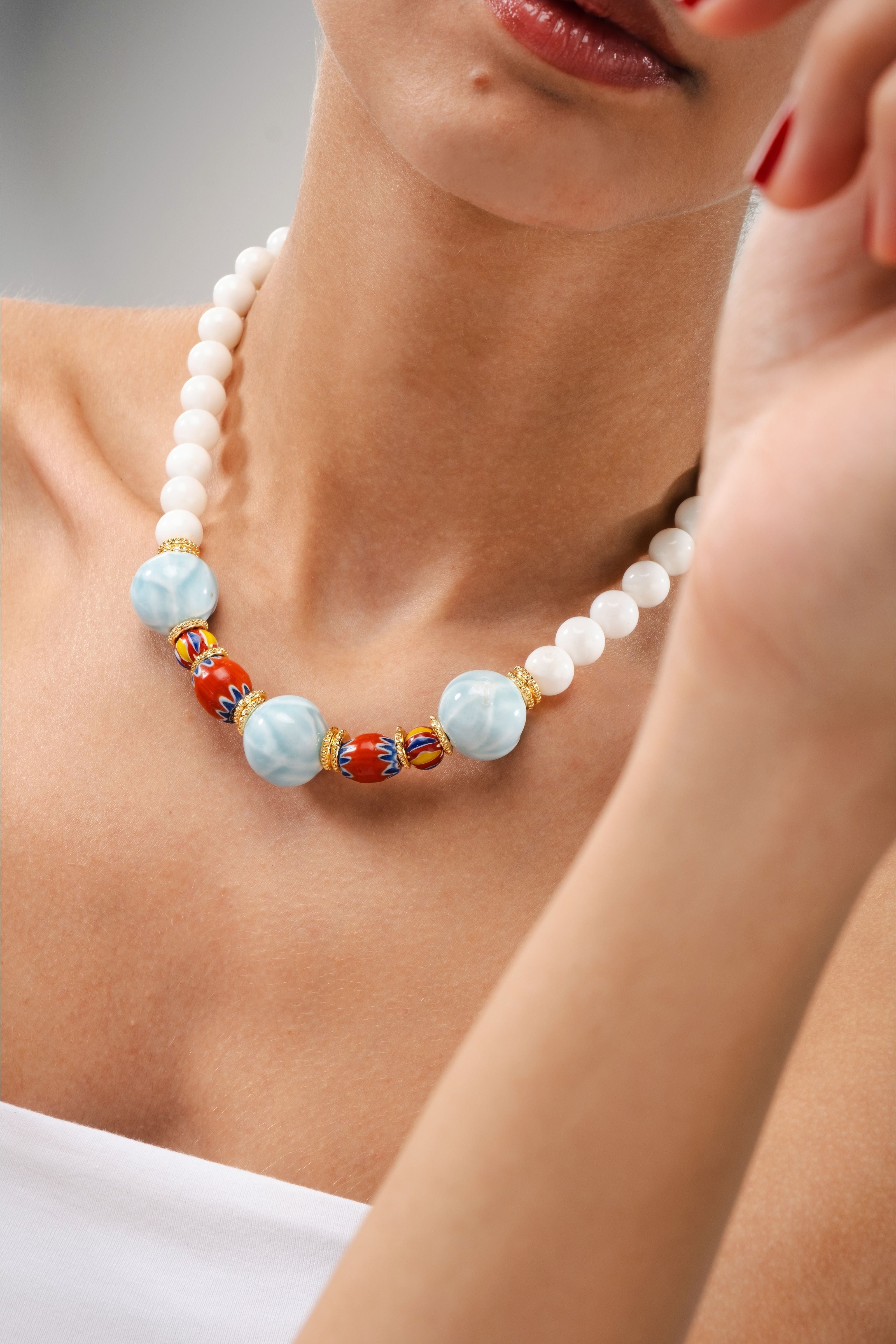 Beyaz sedefin zarafeti, Afrika chevron boncukların kültürel zenginliği ve cam boncukların ışığı bir araya gelerek eşsiz bir tasarımda buluşuyor. El işçiliğiyle hazırlanmış bu kolye, denizin mavisini ve derinliklerin asaletiyle doğanın büyüsünü yansıtır.