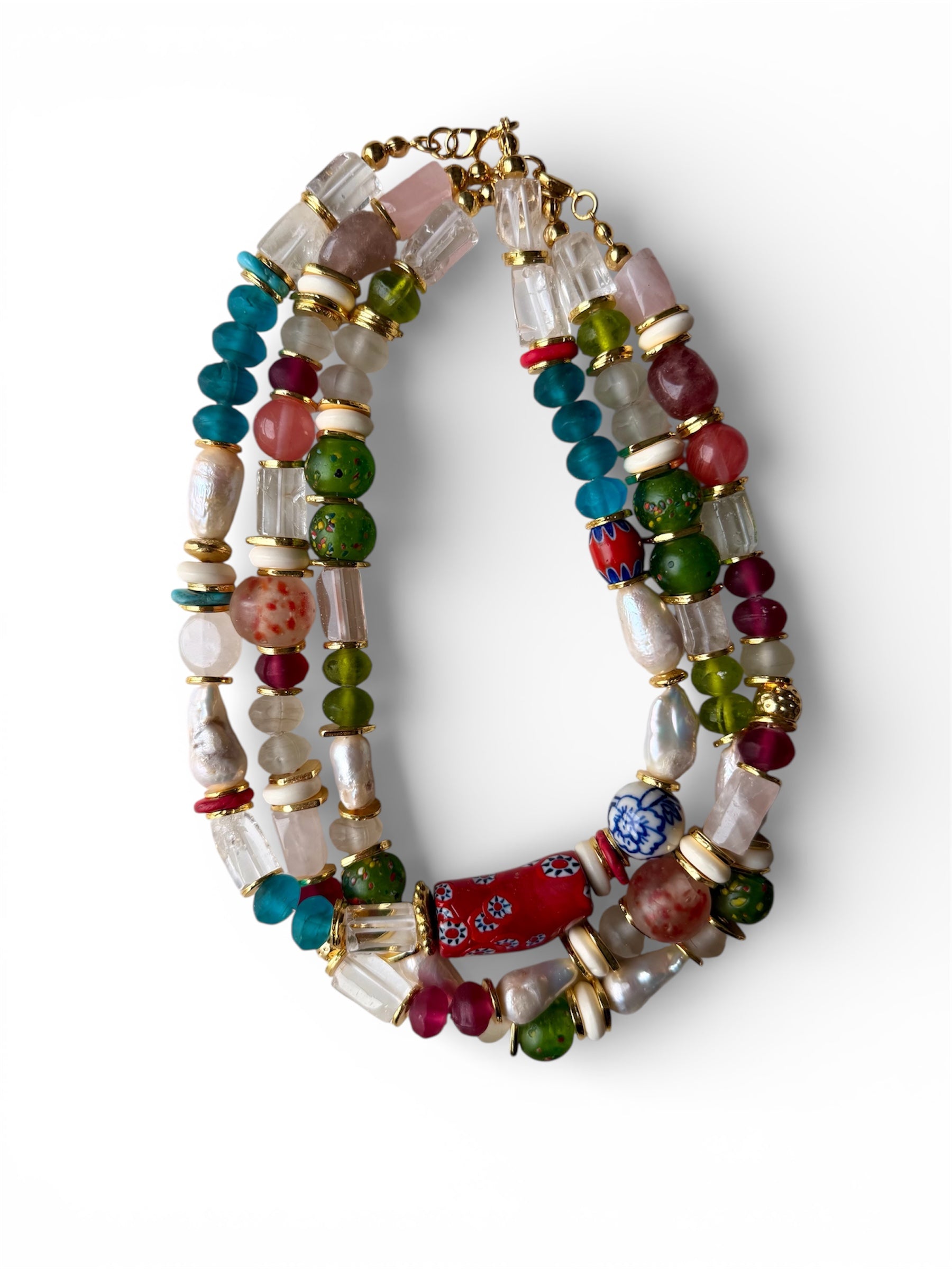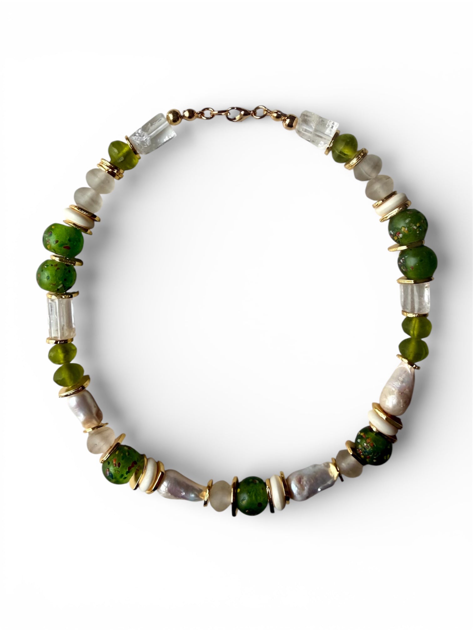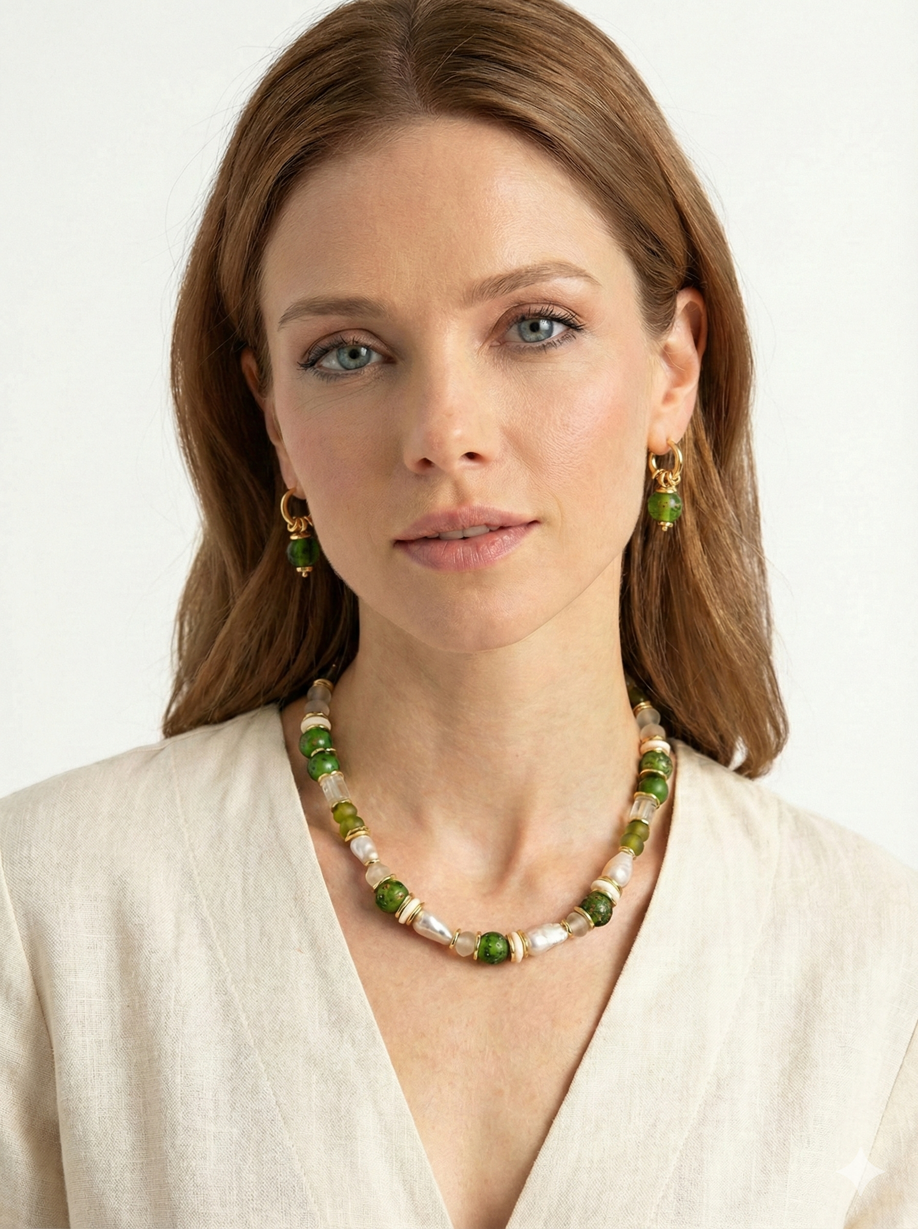 - Malzemeler: Kristal kuvars, cam boncuklar, barok inci, altın kaplama aparatlar