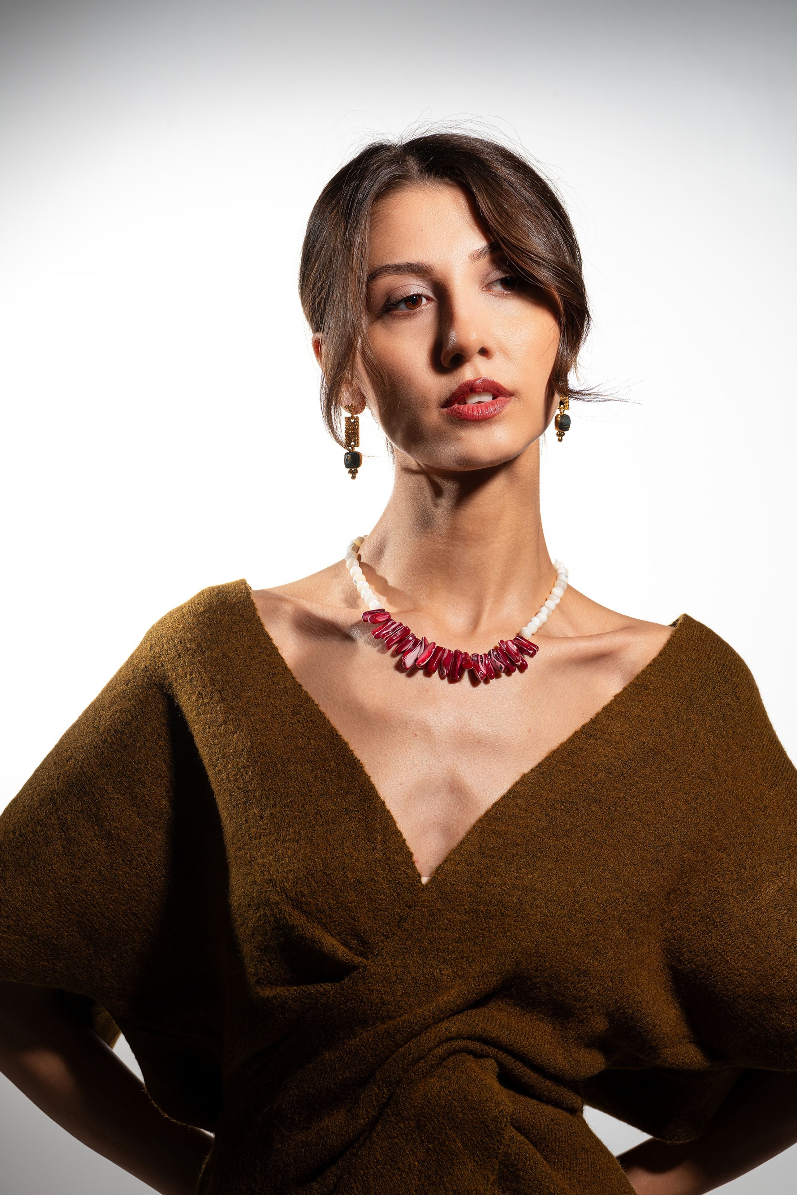 Doğanın sadeliği ile kadın ruhunun gücünü buluşturan bir tasarım… Gül kurusu sedef, sevgi ve inceliğin sembolü olarak ön plana çıkarken, krem cam boncuklar safiyetin ve huzurun temsili oluyor. İkisi birleştiğinde ortaya hem iddialı hem de zarif bir bütün çıkıyor: romantik ama aynı zamanda güçlü bir duruş.
