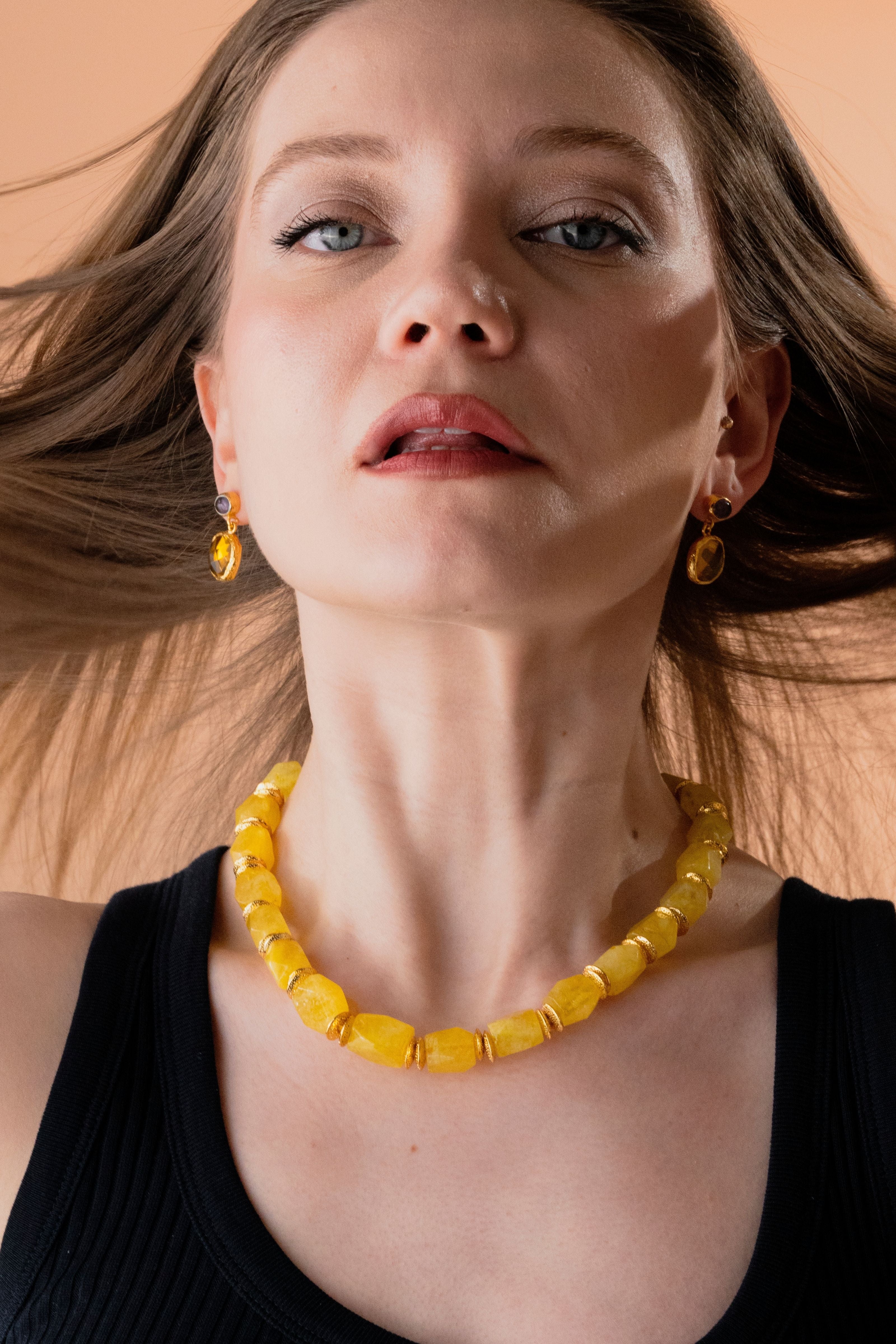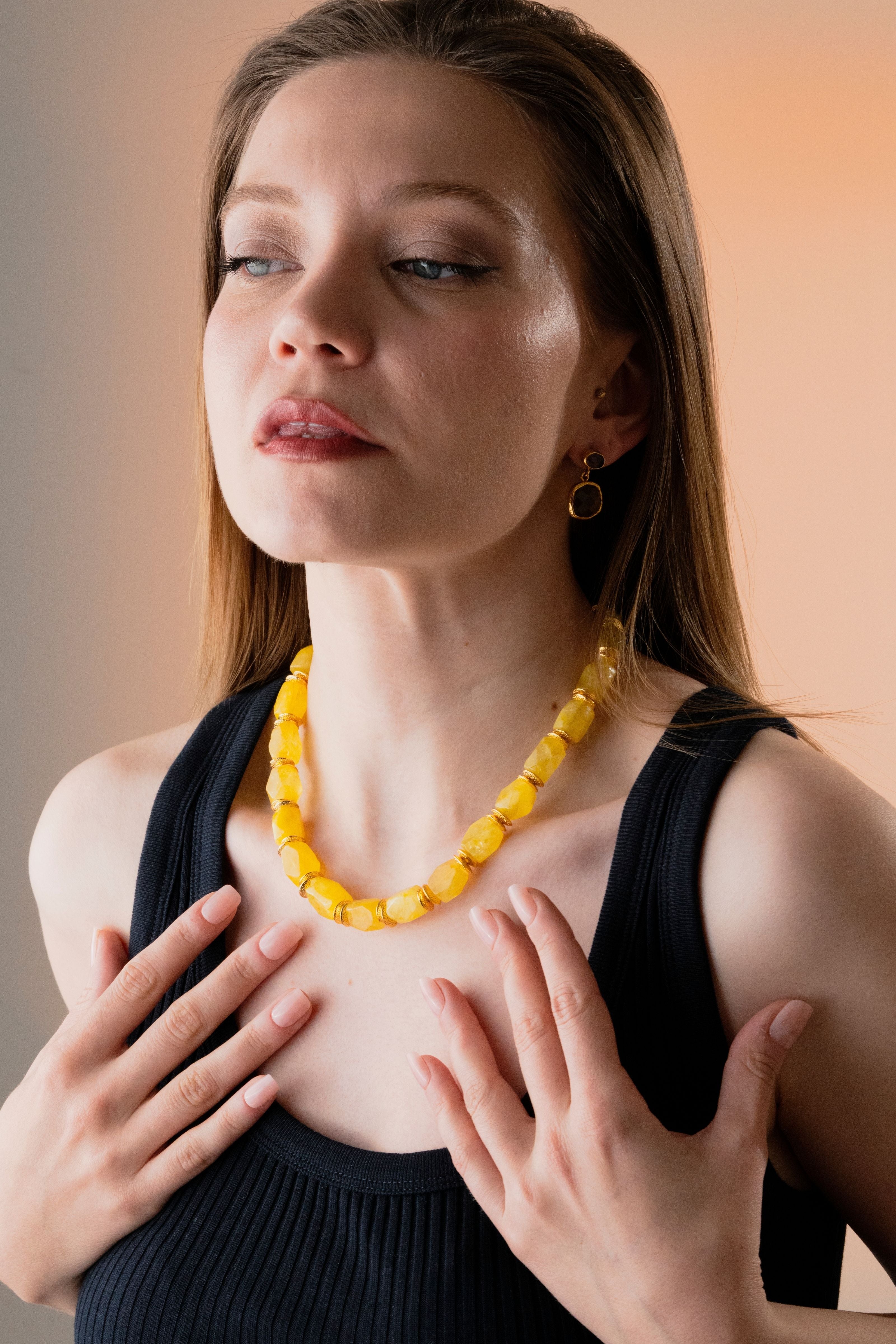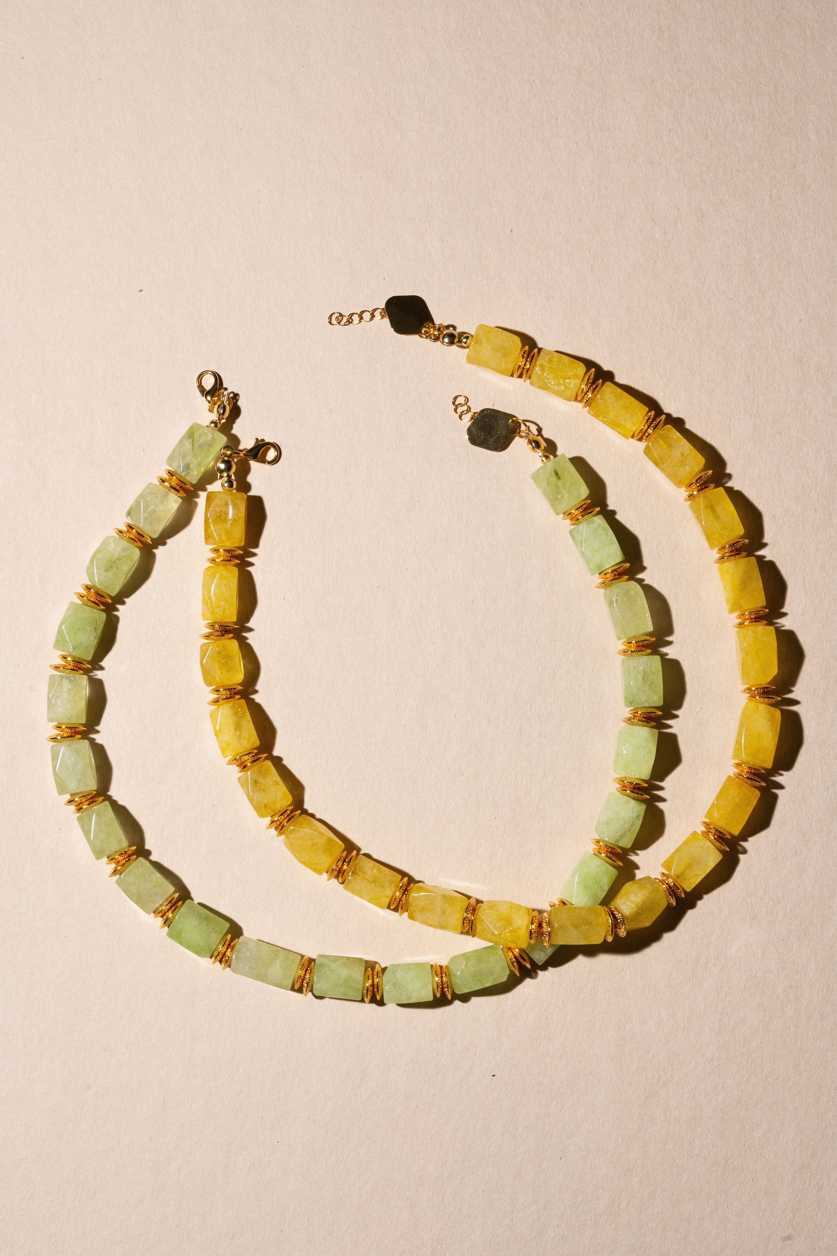 Işıltısı ve enerjisiyle büyüleyen bu özel kolye, doğadan ilham alarak tasarlandı. İri taneli sitrin ve prinayt taşlarının modern yorumuyla hazırlanan bu takı, güçlü bir stil ifadesi sunmak isteyenler için ideal.Her biri doğal formunda seçilmiş sitrin ve prehnit taşları, hem görsel hem de enerjisel açıdan zengin bir bütünlük oluşturur. Sarının sıcak tonu ile yeşilin huzurlu birleşimi, zamansız şıklık arayanlara hitap eder.