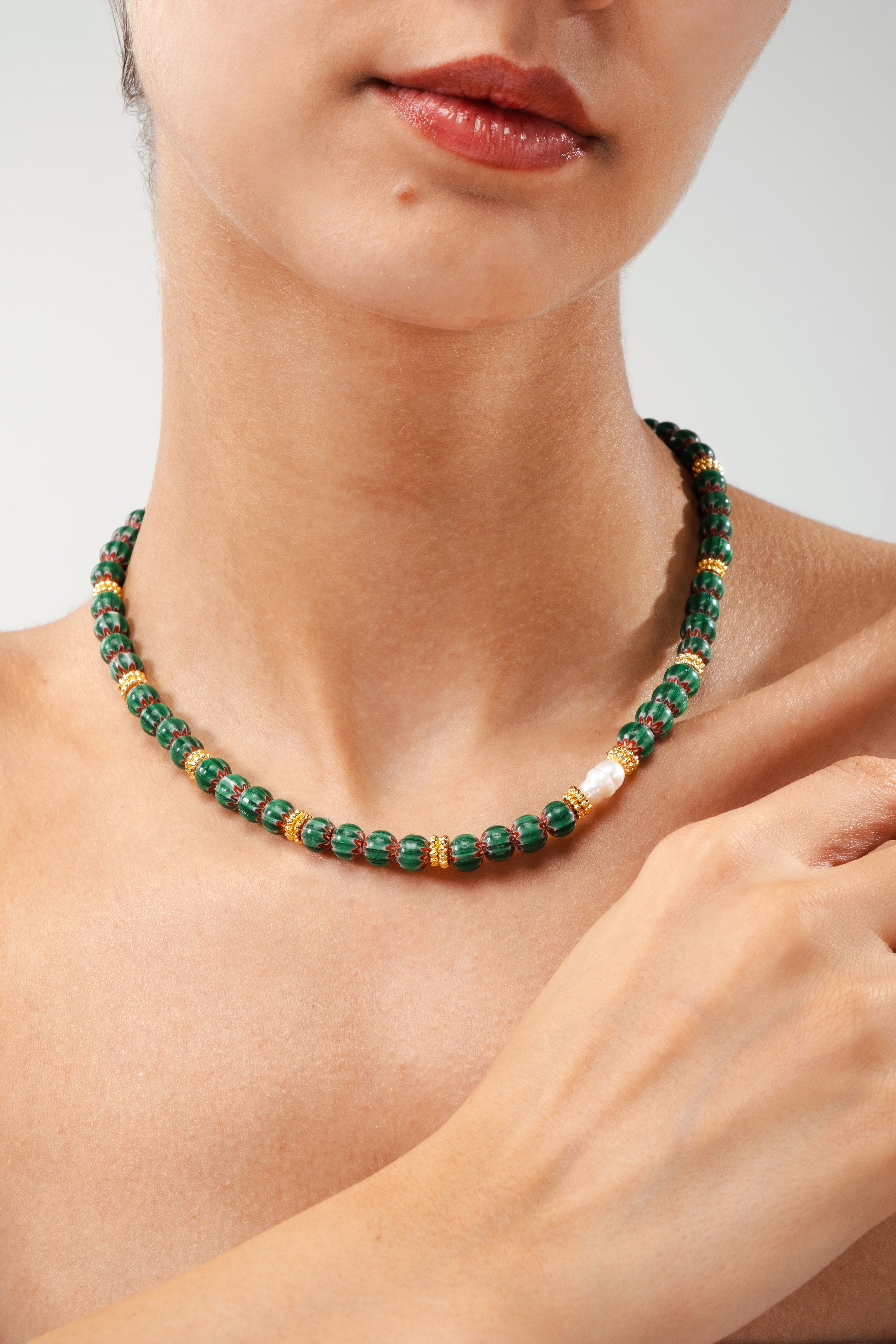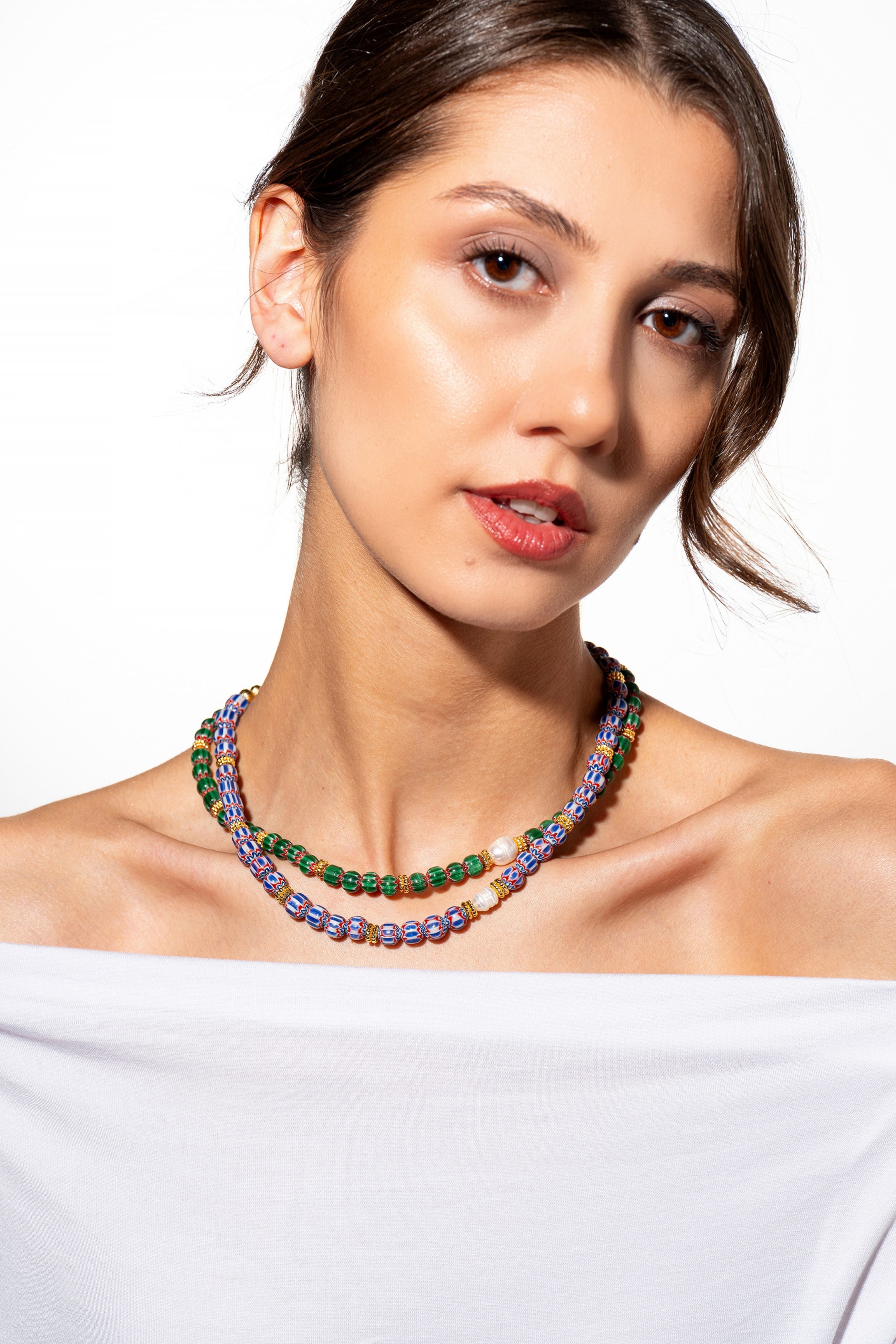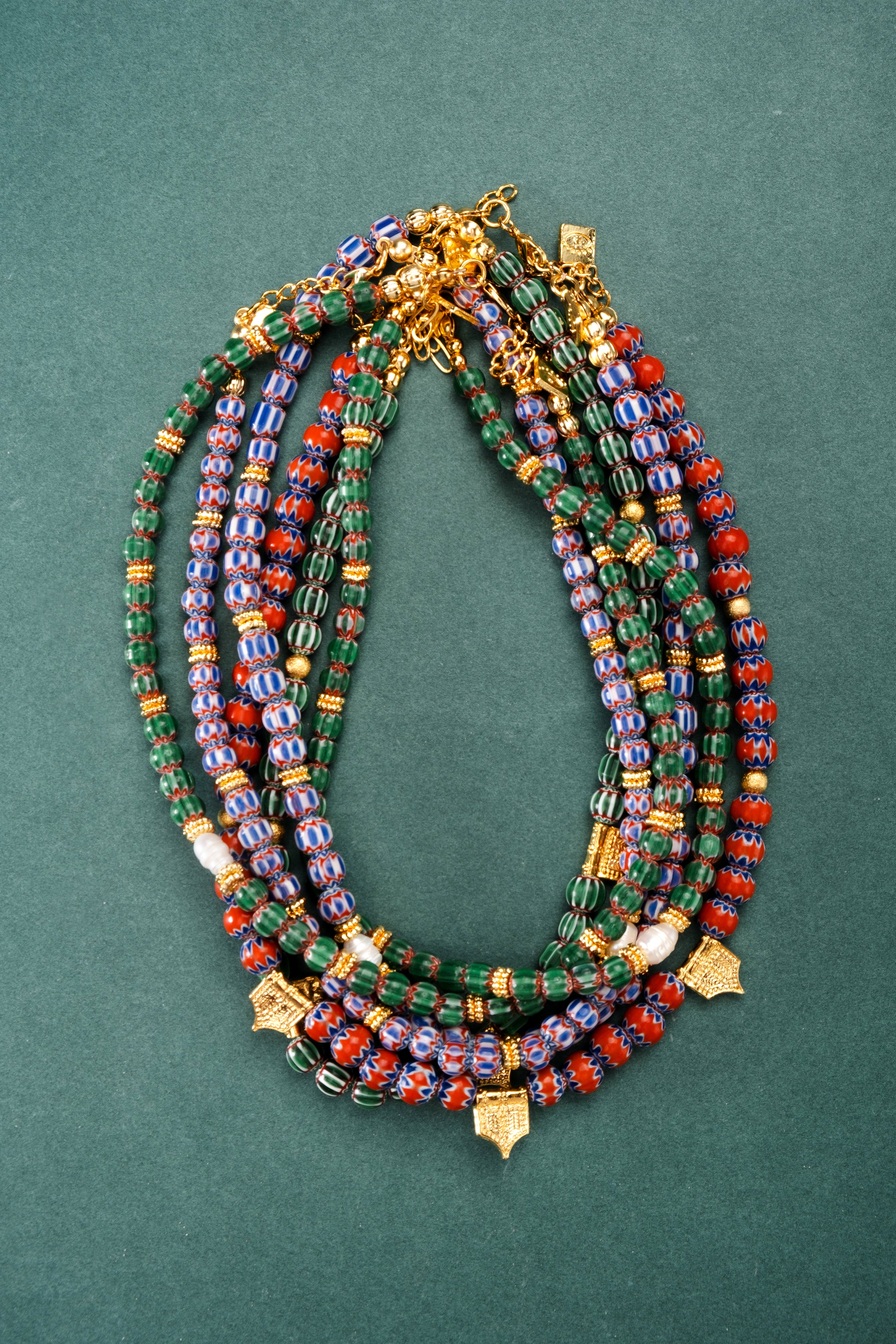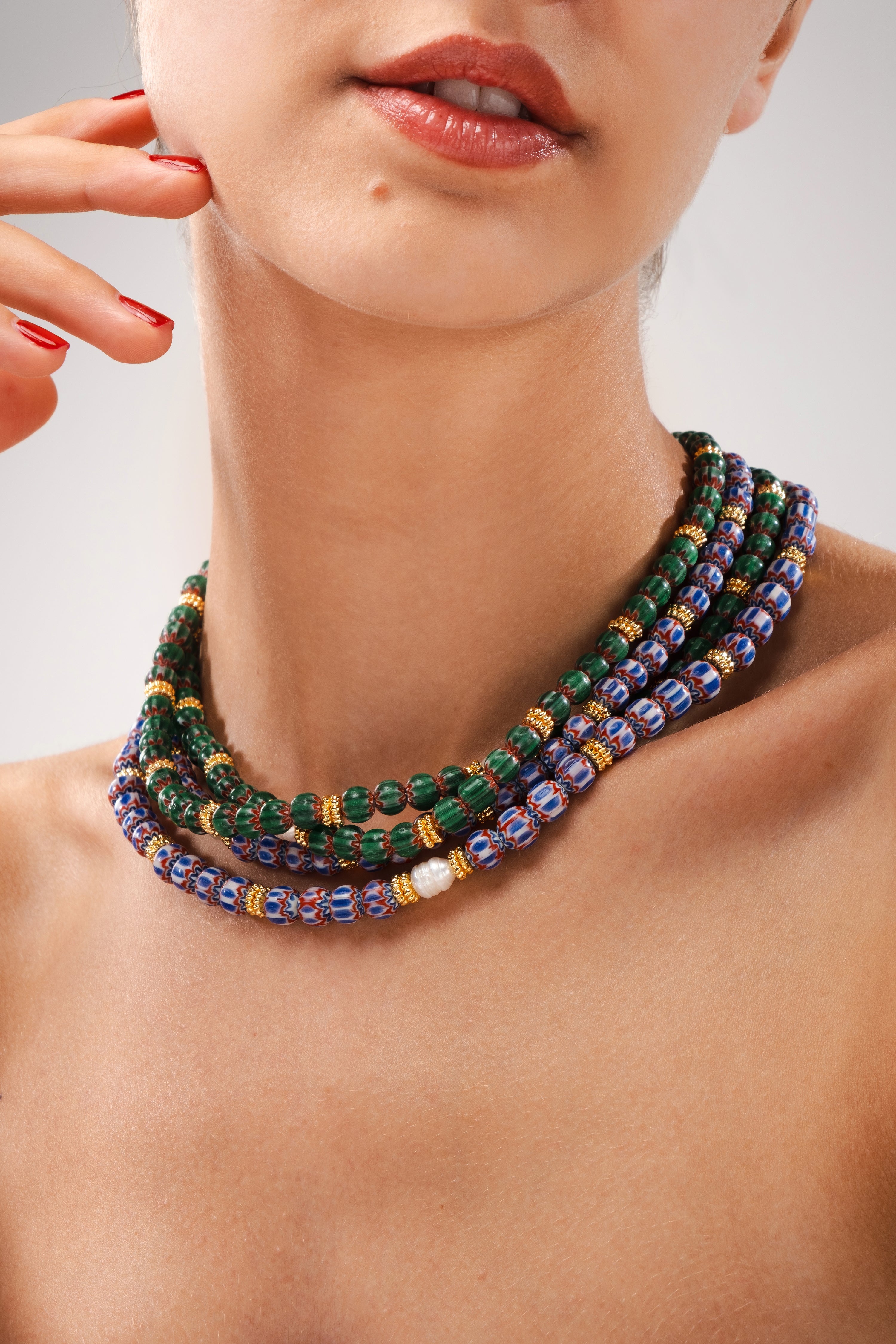 Afrika Chevron cam boncukları, el işçiliğiyle katman katman camın şekillendirilmesiyle üretilen, her biri eşsiz desenlere sahip özel boncuklardır. Renkli  desenleriyle bilinen bu boncuklar, odaklanma, kararlılık ve enerjiyi dengeleme gibi sembolik anlamlar taşır. Bazı kültürlerde ise kişiyi negatif etkilerden koruduğuna ve içsel gücü artırdığına inanılır. İnci ile chevron boncukların eşsiz uyumu Chromo kolyelerde yakalandı.