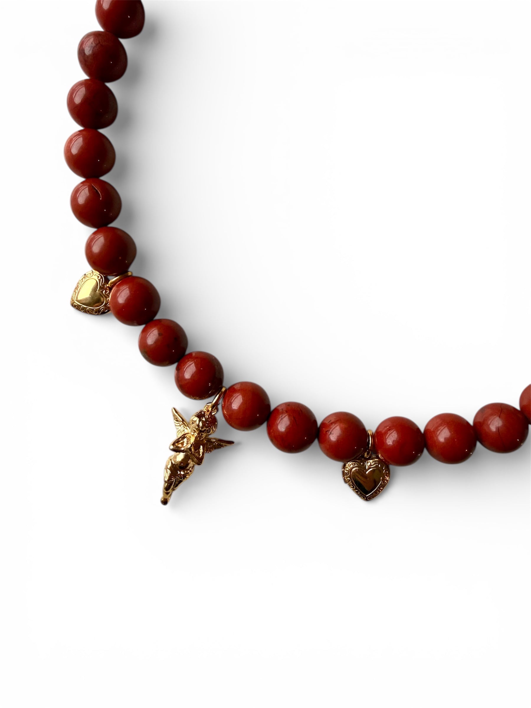 Kızıl jasper taşının güçlü ve topraklayıcı enerjisi, iki küçük kalbin arasında yer alan melek figürüyle anlam kazanıyor. Bu kolye; tutkuyu, sevgiyi ve korunma hissini tek bir zarif formda bir araya getiriyor.