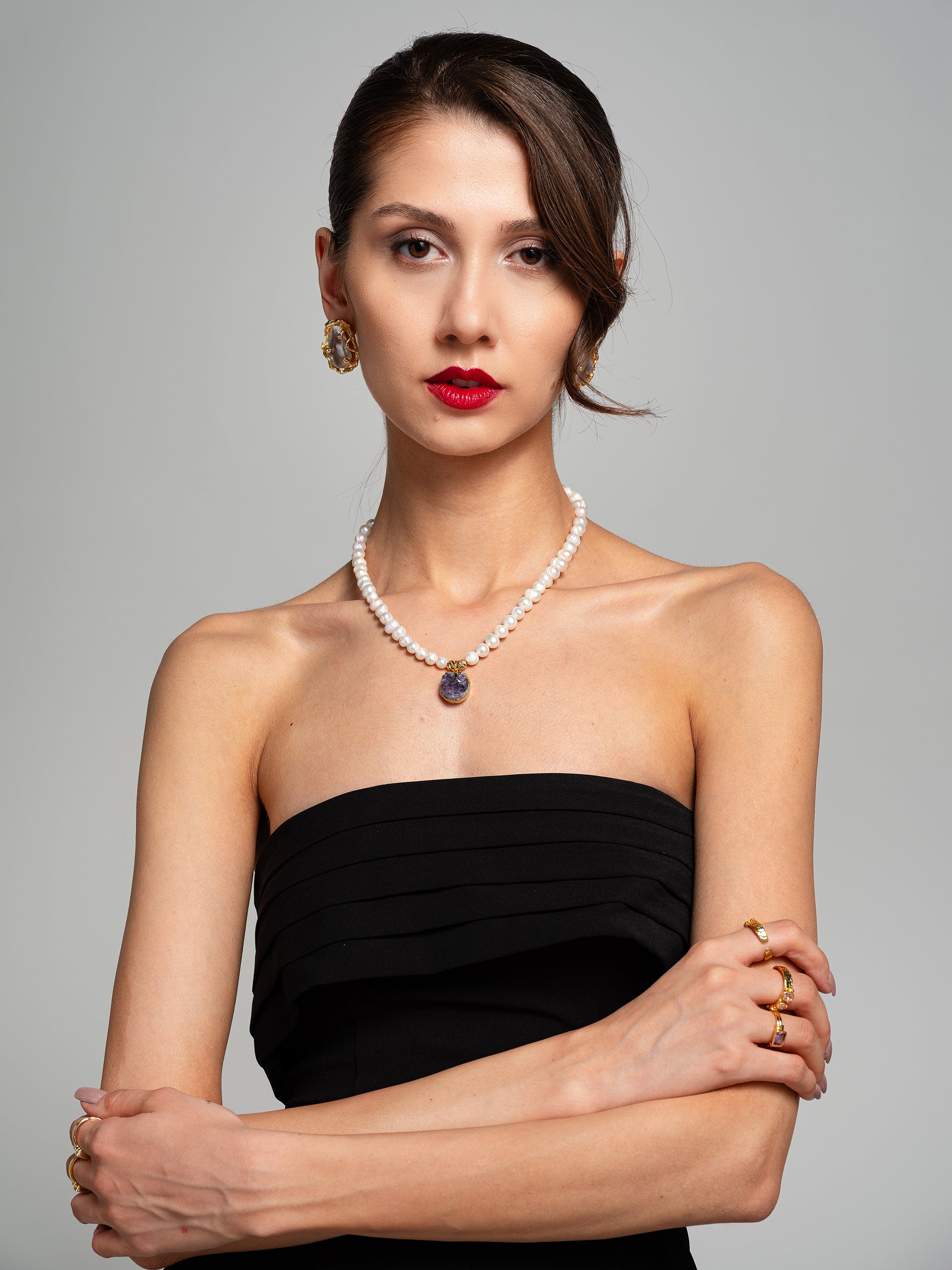 Zarif inci kolye ve çarpıcı ametist kolye ucu ile stilinizi yükseltin. Doğal taş detayları ve hassas işçiliğiyle bu zarif damla kolye hem günlük kullanım hem de özel günler için mükemmeldir. Bu el yapımı mücevher harika bir doğum günü hediyesi veya yılbaşı hediyesi olabilir. Her yaş için tasarlanan bu şık kadın kolyesi, her ana zarafet katıyor.
