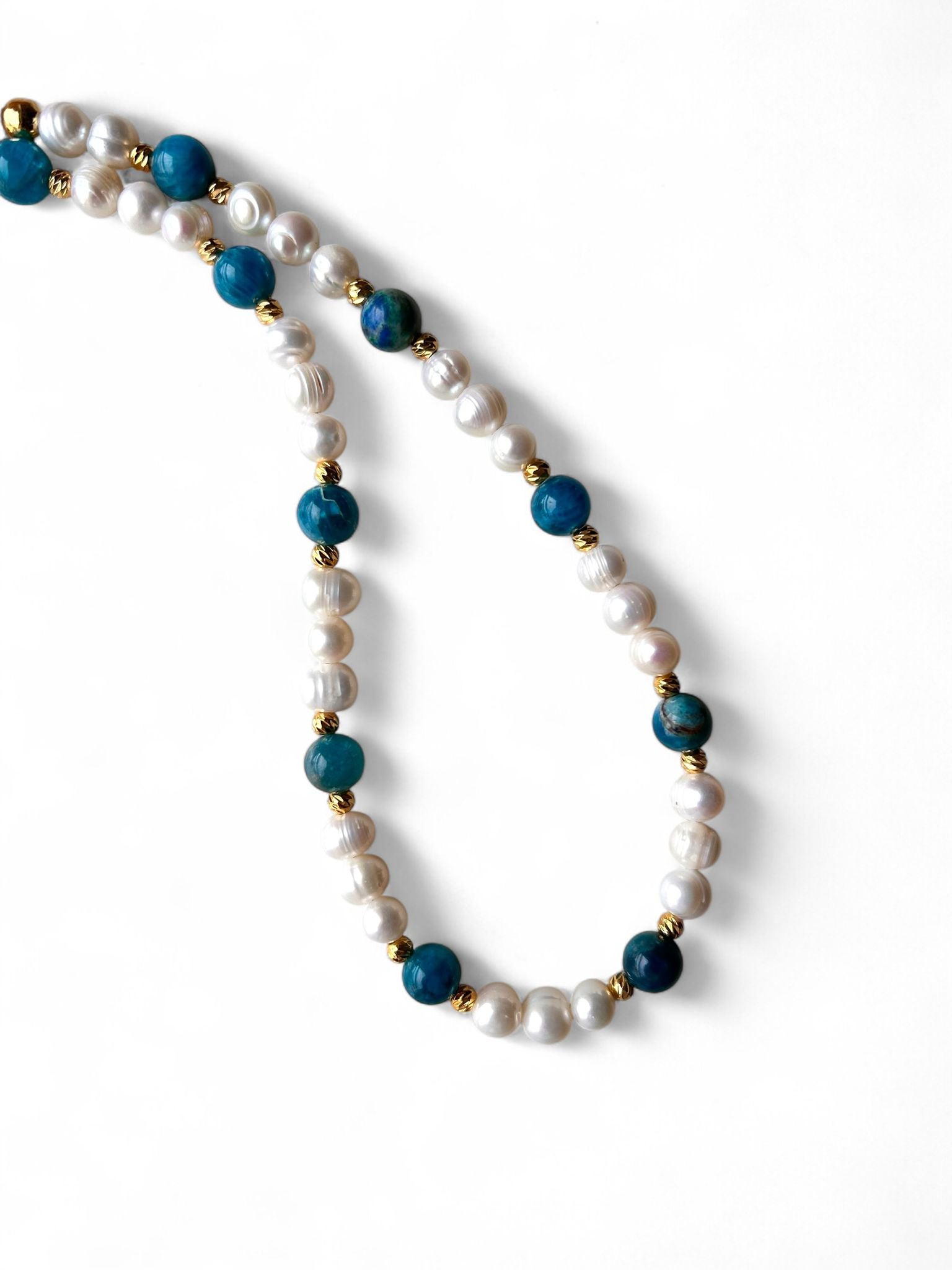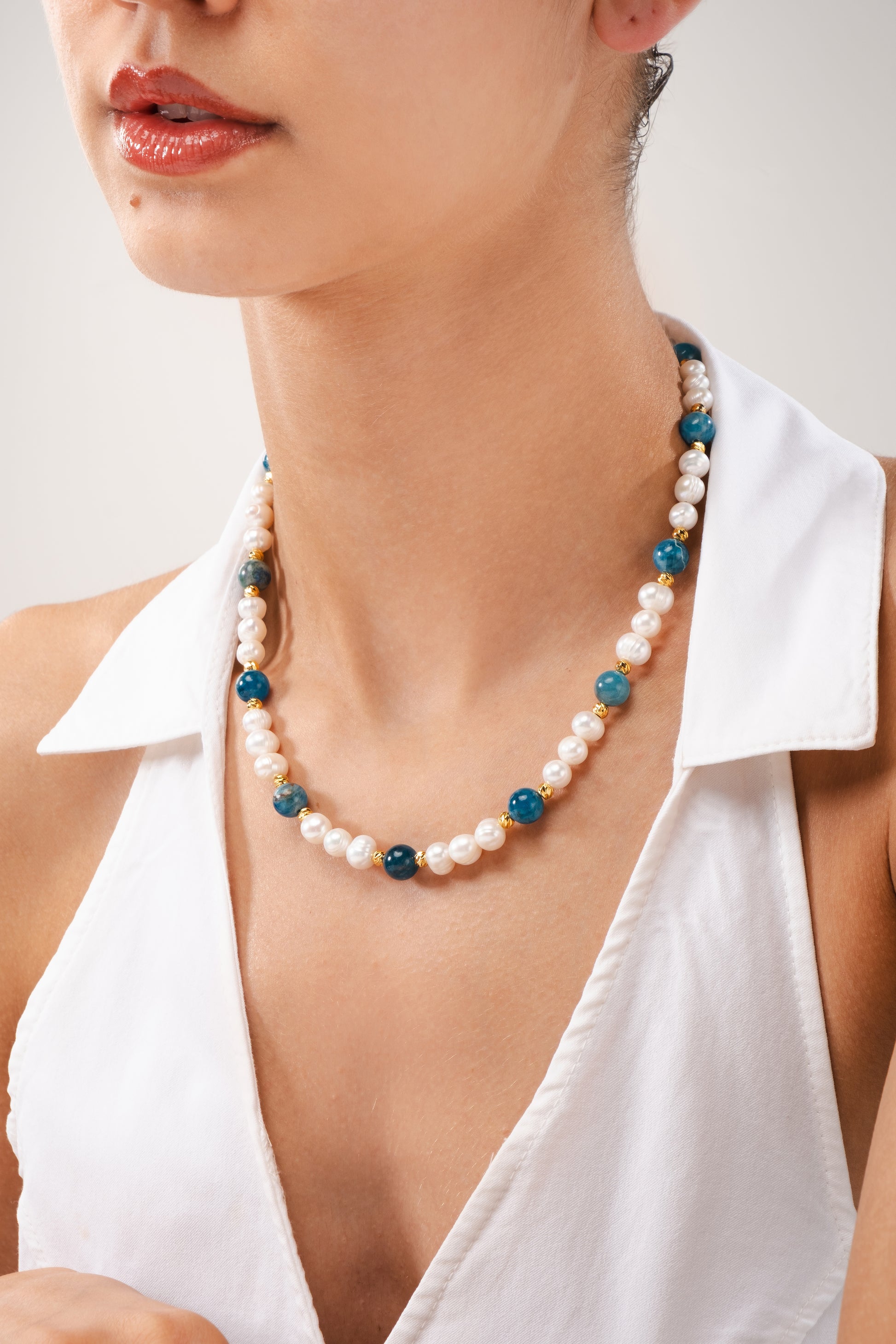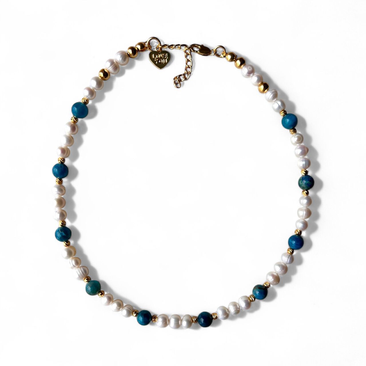 İnci ve apatit taşının buluştuğu bu özel tasarım, zarafet ile enerjiyi bir araya getiriyor. Saflığın ve dinginliğin sembolü olan inci, doğal şıklığınızı yansıtırken; apatit taşı ruhsal berraklığı, yaratıcılığı ve motivasyonu destekler. Günlük stilinize sofistike bir dokunuş katan bu parça, aynı zamanda içsel denge ve pozitif enerji taşıyan güçlü bir yol arkadaşıdır.