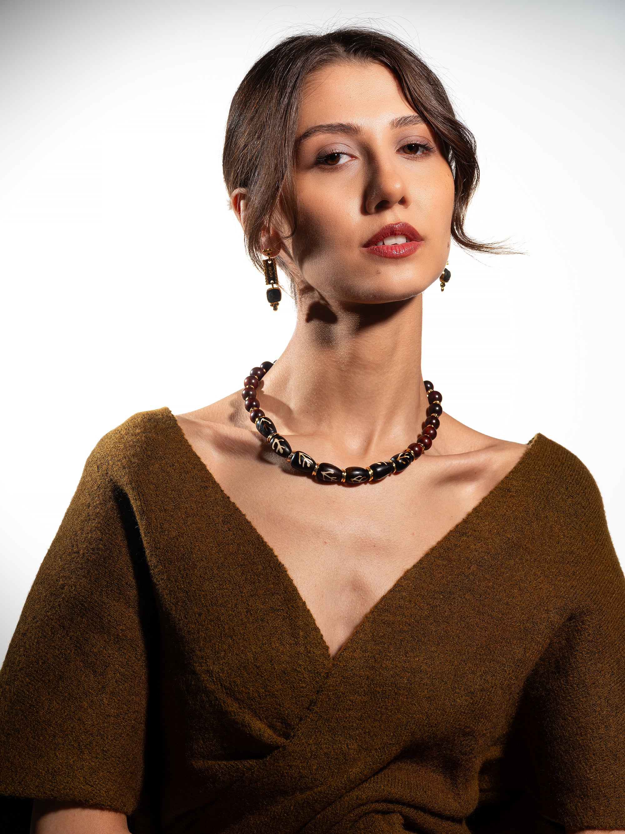 Doğallığın sıcaklığını stilinize taşıyan bu etnik kolye, ahşap ud ağacı boncukları ve özenle seçilmiş desenli parçalarıyla özgün bir karakter sunuyor. Etnik kolye, doğal taşlı kolye ve ahşap boncuk kolye arayışında olanlar için ideal olan tasarım, Terra Koleksiyonu’nun doğadan ilham alan ruhunu yansıtıyor. Günlük stilinize doğal bir zarafet katarken, aynı zamanda zamansız bir bohem şıklık yaratıyor.