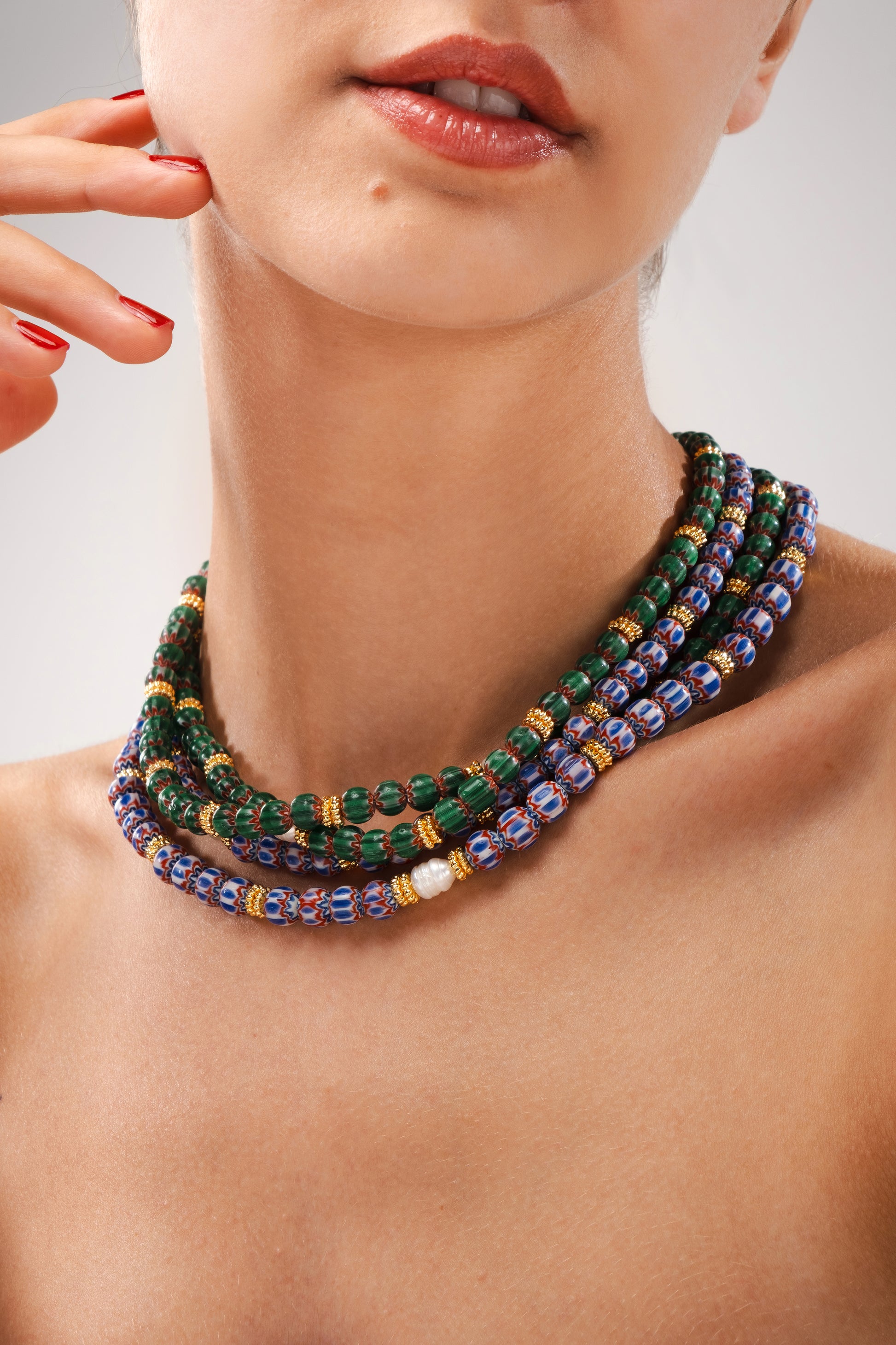 Afrika Chevron cam boncukları, el işçiliğiyle katman katman camın şekillendirilmesiyle üretilen, her biri eşsiz desenlere sahip özel boncuklardır. Renkli desenleriyle bilinen bu boncuklar, odaklanma, kararlılık ve enerjiyi dengeleme gibi sembolik anlamlar taşır. Bazı kültürlerde ise kişiyi negatif etkilerden koruduğuna ve içsel gücü artırdığına inanılır. İnci ile chevron boncukların eşsiz uyumu Chromo kolyelerde yakalandı.